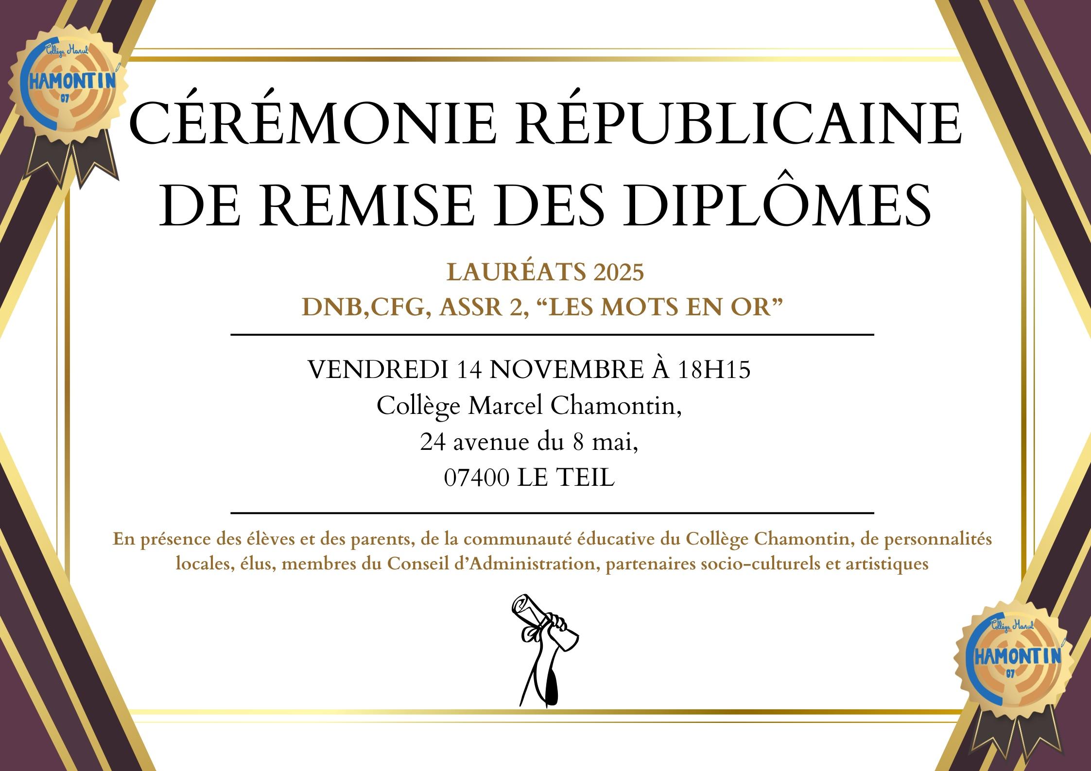 Nous sommes ravis de mettre à l'honneur nos diplômés lors de la cérémonie républicaine qui se tiendra la vendredi 14 novembre au collège.