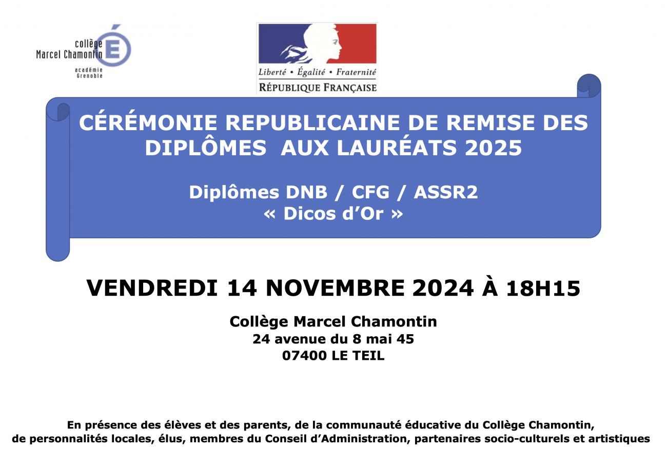 Nous sommes ravis de mettre à l'honneur nos diplômés lors de la cérémonie républicaine qui se tiendra la vendredi 14 novembre au collège.