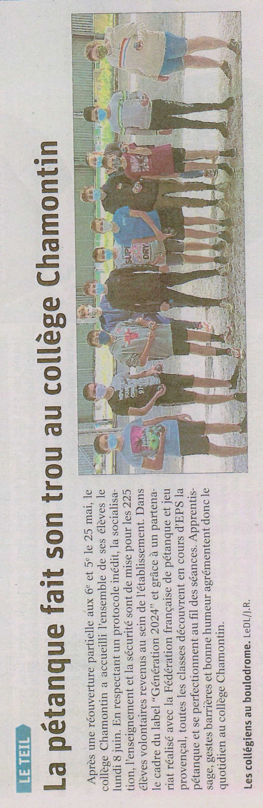 Grâce au label "Génération 2024" et un partenariat avec la fédération française de pétanque, le collège a été doté de plusieurs jeux de pétanque. Le Dauphiné Libéré a réalisé un article à ce sujet. Cliquer sur chaque image pour la visualiser en pleine taille